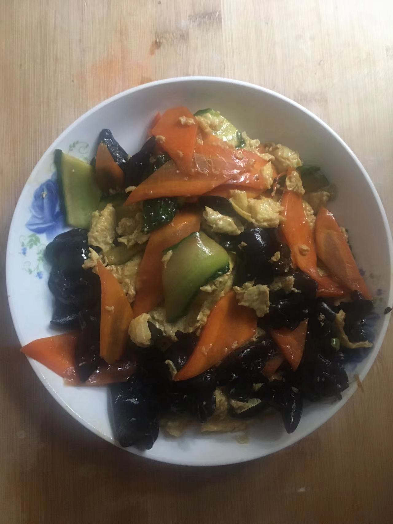 黄瓜、木耳、鸡蛋、胡萝卜、葱、姜、玉米淀粉、生抽、酱油