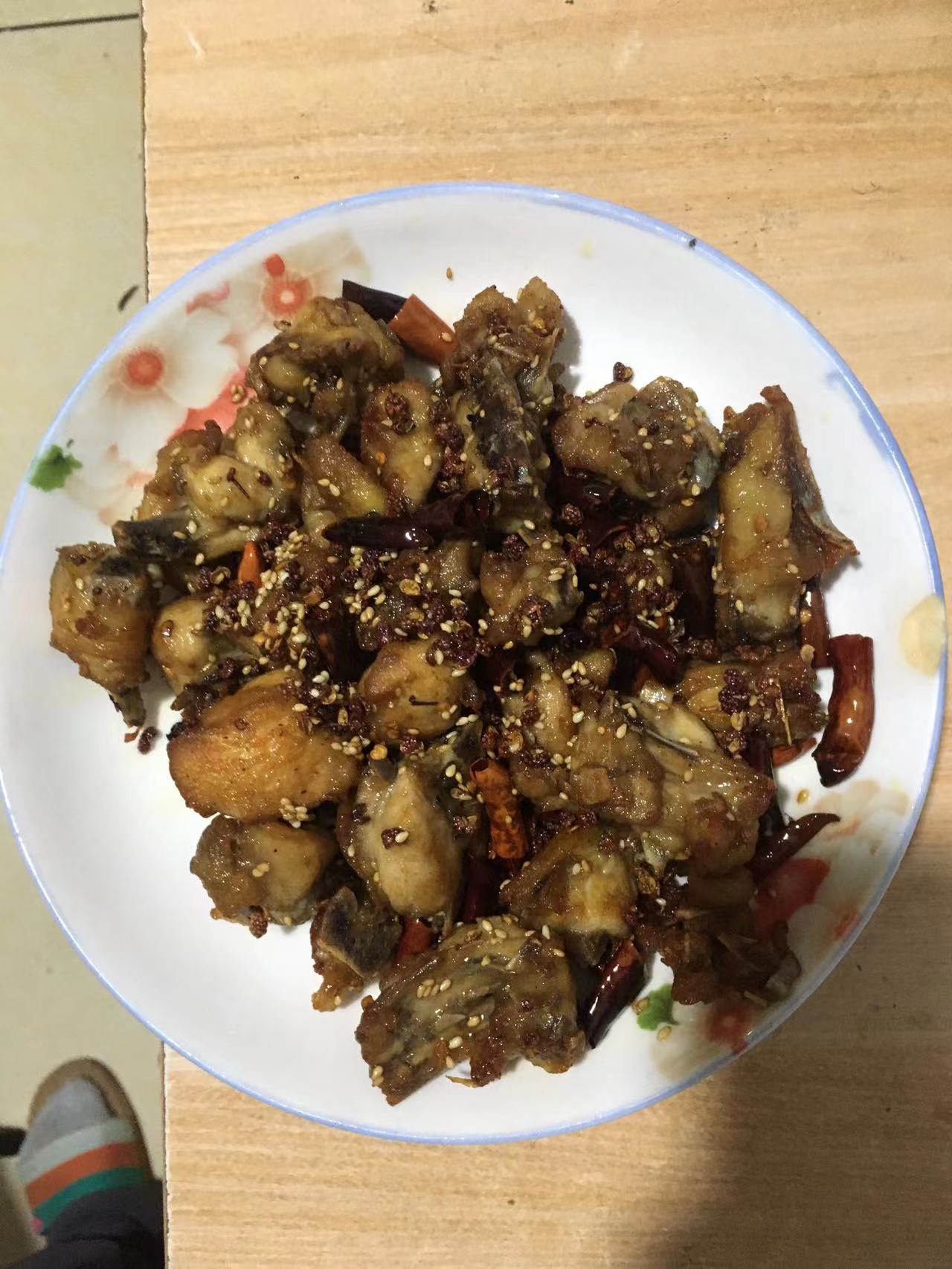 2.锅中放入适量香油和食用油、煸炒适量花椒和干辣椒,煸炒至出香后,放入鸡块儿。火调到一点。翻炒至出香,加入适量香油,最后放入芝麻点缀均匀即可
