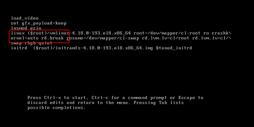 - 附加rd.break。利用该选项,就在系统从initramfs向实际系统一脚控制权前,系统将会中断。